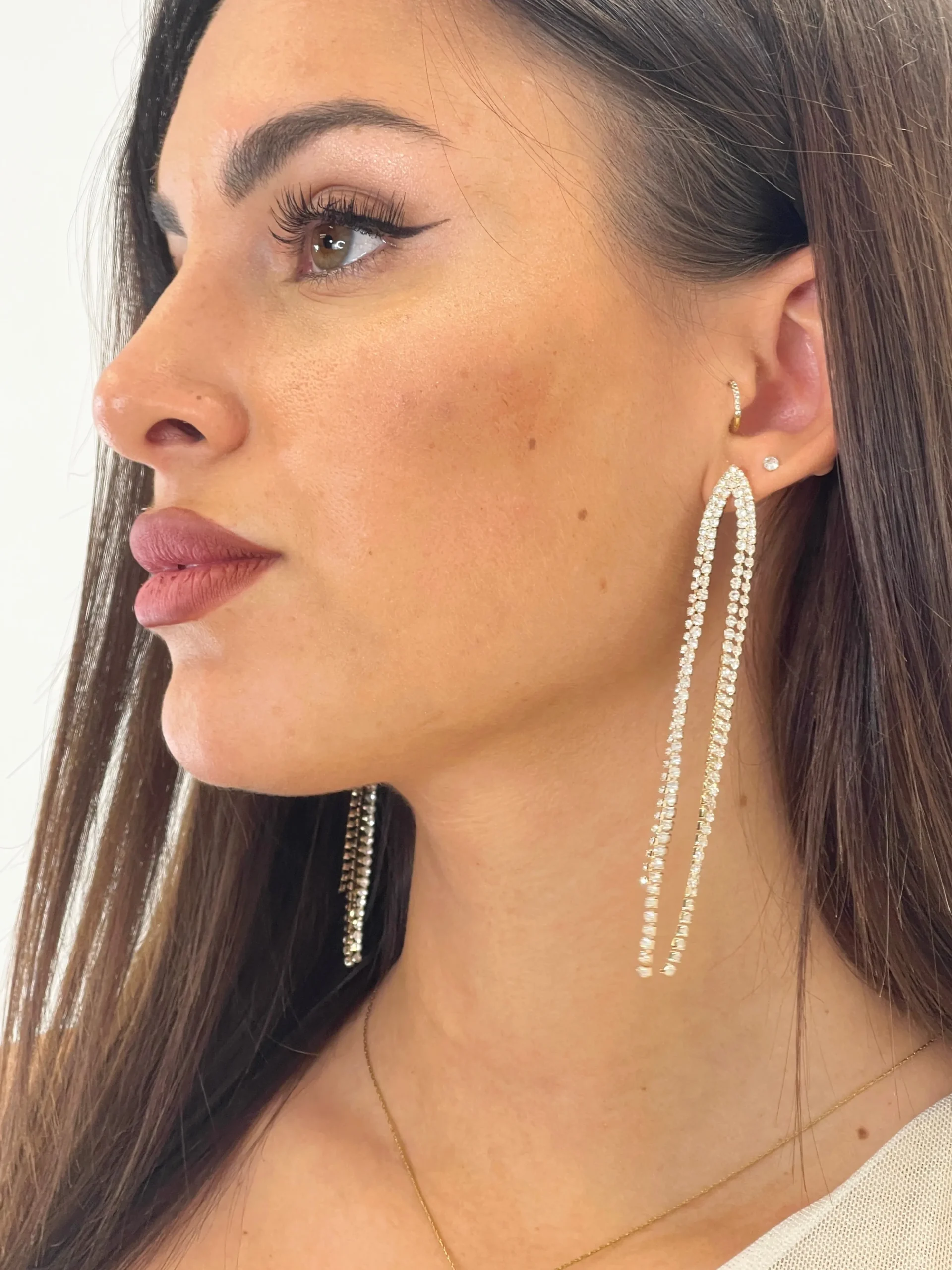 Pendientes colgante largos en forma y tiras con aplique de cristales. Cierre de broche en la parte trasera. Fabricados en golfi.